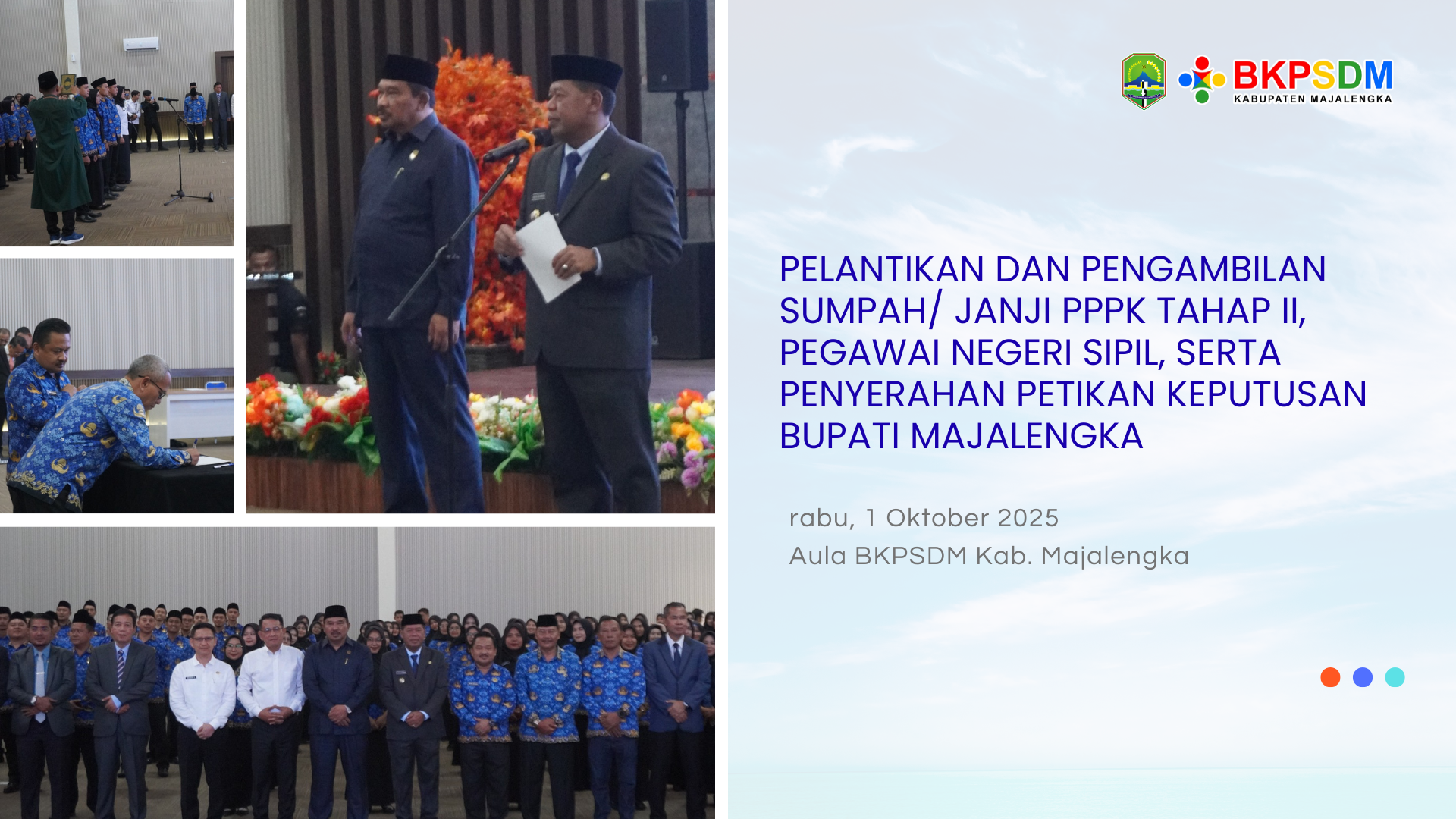 Majalengka - Bupati Kabupaten Majalengka Drs. H. Eman Suherman, M.M. secara resmi mengambil sumpah / janji kepada 101 (Seratus Satu) Pegawai Pemerintah dengan Perjanjian Kerja (PPPK) Tahap II, 2 (Dua) Optimalisasi Pegawai Pemerintah dengan Perjanjian Kerja (PPPK) Tahap I, 1 (Satu) Pegawai Pegeri Sipil (PNS) dan 1 (Satu) Calon Pegawai Negeri Sipil Lulusan IPDN, sekaligus Penyerahan Petikan Keputusan Bupati Majalengka tentang Pengangkatan PPPK, Pengangkatan PNS, serta Calon Pegawai Negeri Sipil Lulusan IPDN di lingkungan Pemerintah Kabupaten Majalengka. yang bertempat di Aula BKPSDM Kabupaten Majalengka, Rabu 1 Oktober 2025.
