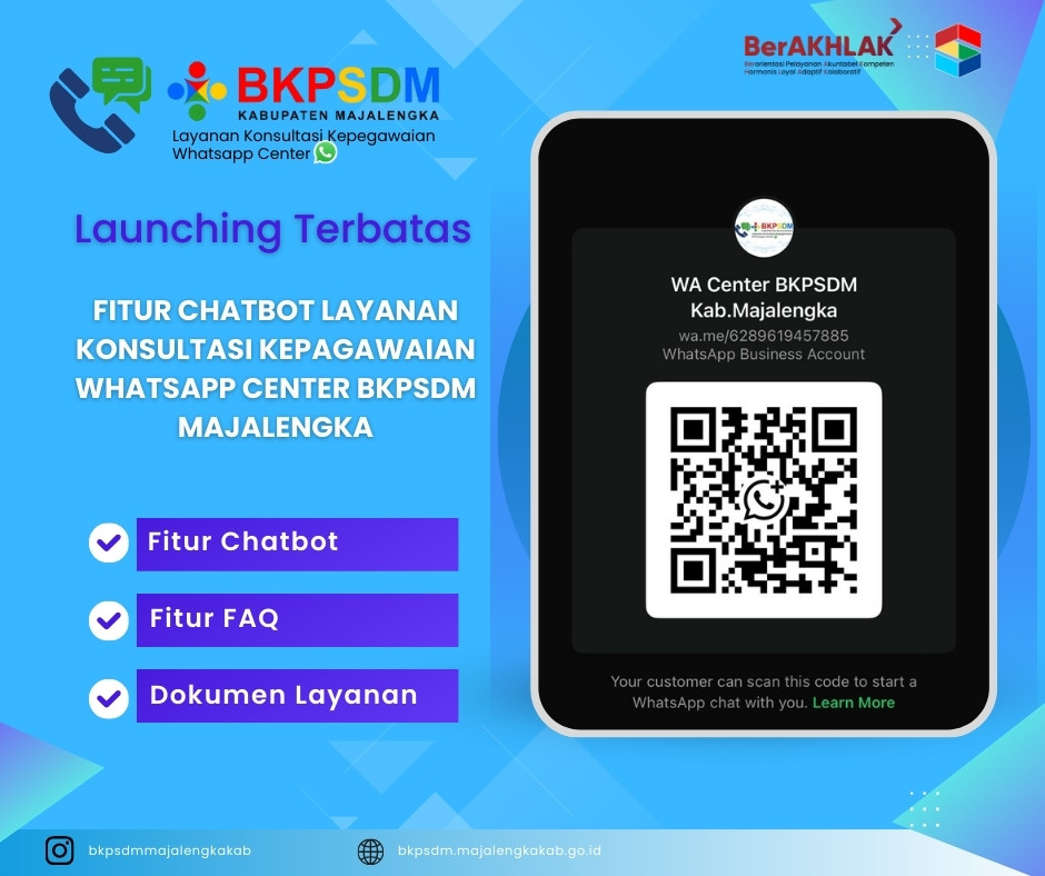 Dalam rangka meningkatkan kualitas layanan konsultasi kepegawaian dan kemudahan akses informasi bagi seluruh Aparatur Sipil Negara (ASN), BKPSDM Kabupaten Majalengka telah mengimplementasikan Fitur Chatbot Layanan Konsultasi Kepegawaian (WA Center BKPSDM Majalengka).